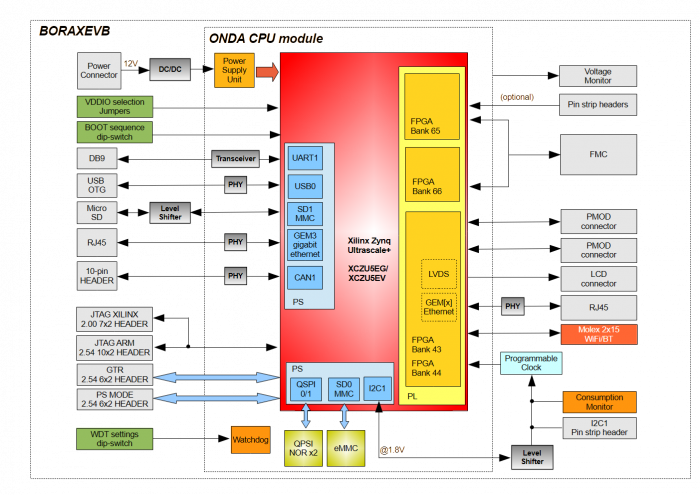 • 2.54mm-pitch pin-strip connectors for ONDA PS and PL configurable peripherals (MIO and EMIO interfaces, GPIOs, custom IPs, ..)